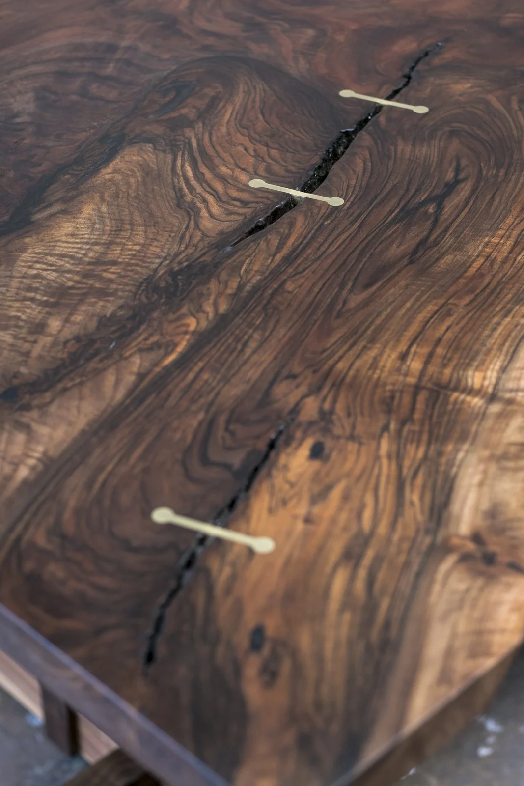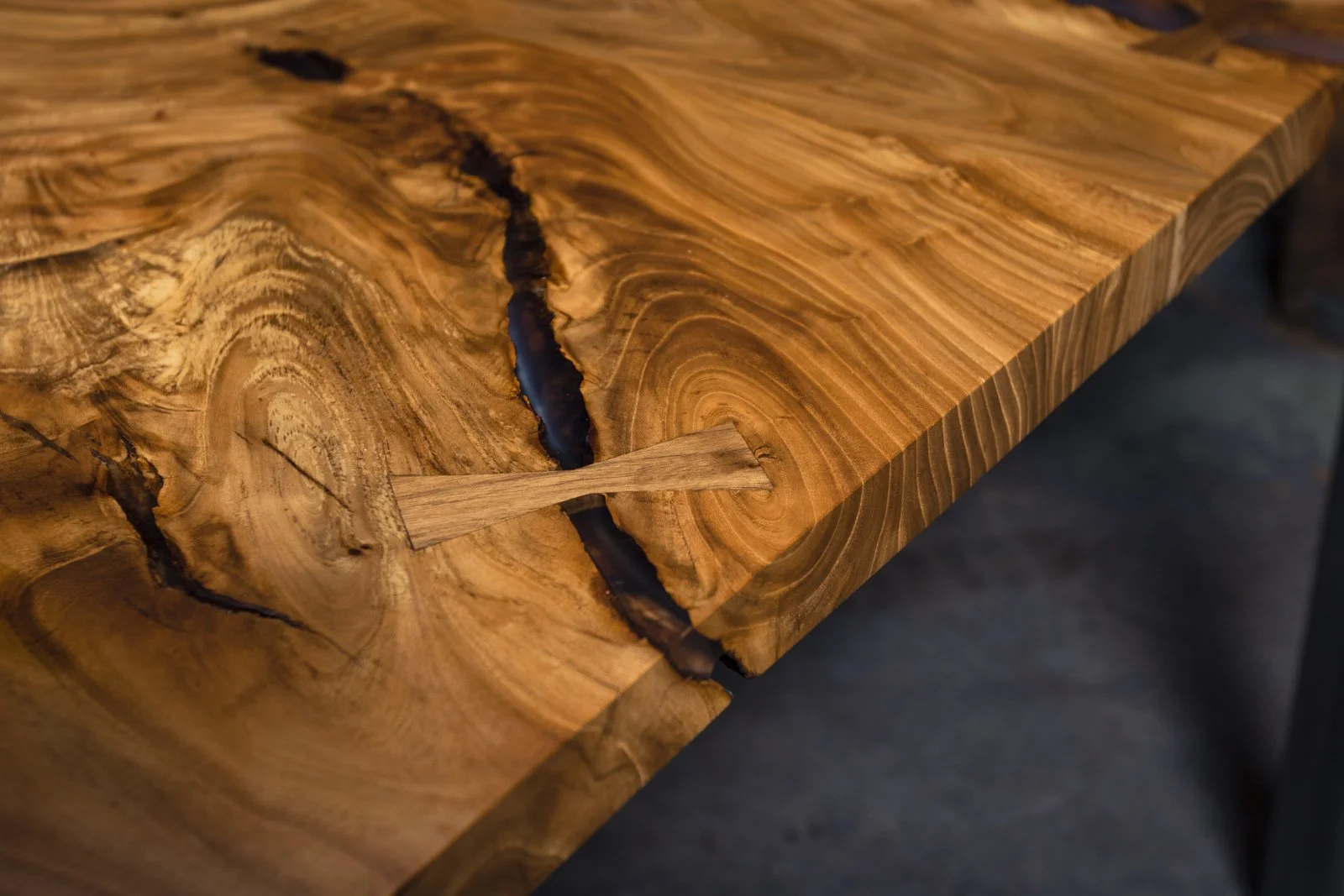 Wood expands and contracts with seasonal changes in the surrounding humidity and temperature. More humid air will cause wood to expand; drier air will cause wood to contract. This movement is a natural occurrence and all wood furniture, wood flooring and other wood household items will experience movement to a certain degree. Wood movement can be minimized and often go unnoticed when the wood is processed properly. It can never be completely avoided, and even when properly processed there can always be things under the surface that can make movement unpredictable or inevitable. One thing we always emphasize to our clients who choose to own a slab table is that the “imperfections” should be understood embraced, especially since each piece we make is completely unique from one other.